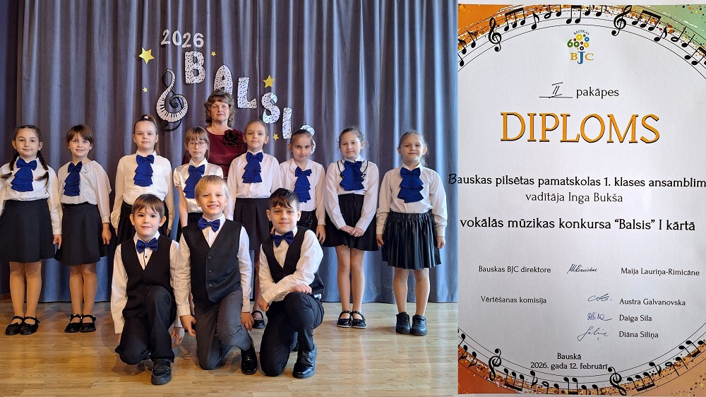 Mūsu skola 12.februārī kļuva par vokālās mūzikas konkursa “Balsis- 2026” 1.kārtas norises mājvietu. Konkursā līdzās citiem novada izglītības iestāžu skolēnu ansambļiem uzstājās un žūrijas vērtējumu arī pelnīja divi mūsu dziedošie kolektīvi. Ingas Bukšas vadītais 1.klašu ansamblis ieguva 2.pakāpes diplomu, bet Ilzes Bērziņas skolotie enerģiskie puikas, kas kopā dzied 3.-4.klašu zēnu ansamblī, izpelnījās 1.pakāpes diplomu. Sveicam un lepojamies!