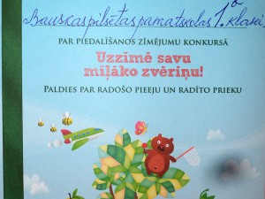Skolotāja Gunta Spure jau vairākus gadus rosina savus skolēnu piedalīties “Manas Aptiekas”rīkotajos zīmējumu konkursos. Šogad konkursa tēma bija “Uzzīmē savu mīļāko zvēriņu!”. Nu konkurss noslēdzies, un 1.b klases zīmējumi saņēmuši atzinību. Skolotāja lepojas ar saviem audzēkņiem un mēs arī!